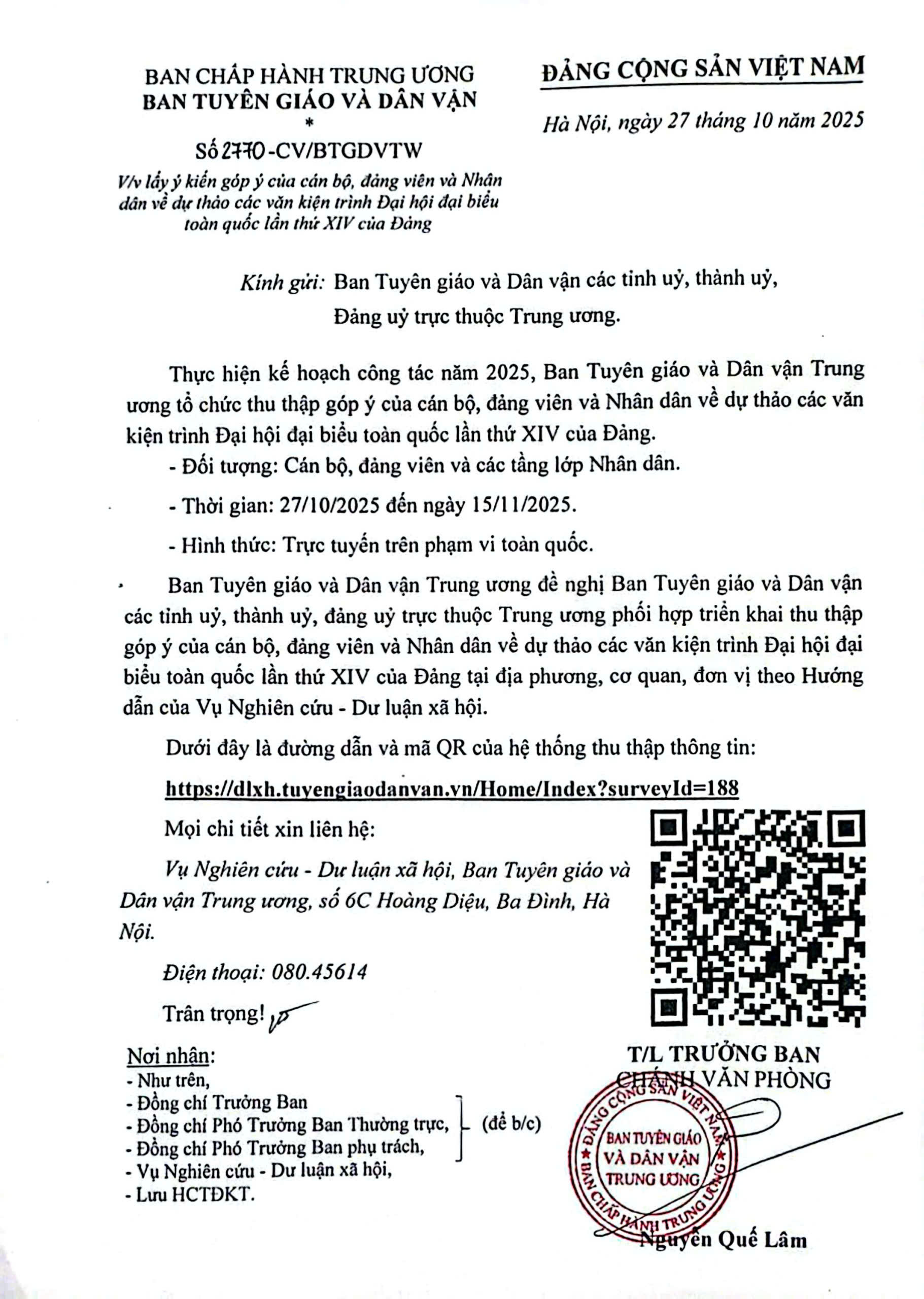 Để phát huy trí tuệ, tâm huyết của cán bộ, đảng viên và Nhân dân góp ý vào Dự thảo các Văn kiện trình Đại hội đại biểu toàn quốc lần thứ XIV của Đảng, Ban Tuyên giáo và Dân vận Trung ương trân trọng đề nghị ông (bà) tích cực tham gia góp ý vào các nội dung dưới đây (để xem chi tiết xin bấm vào tên từng dự thảo văn kiện đính kèm): https://dlxh.tuyengiaodanvan.vn/Home/Index?surveyId=188&test=True