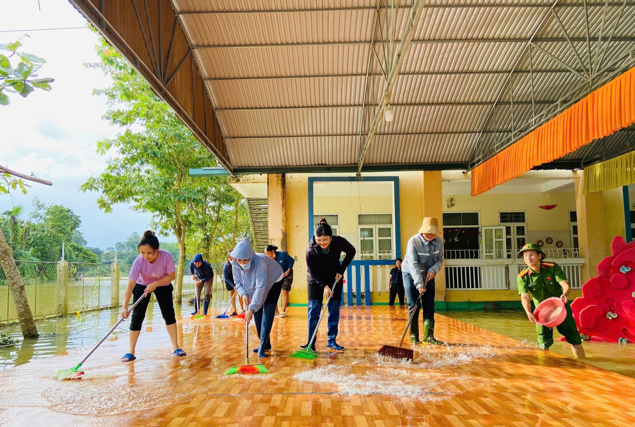 Lực lượng Công an xã Kim Hoa hỗ trợ Trường Mầm non Kim Hoa khắc phục hậu quả mưa lũ