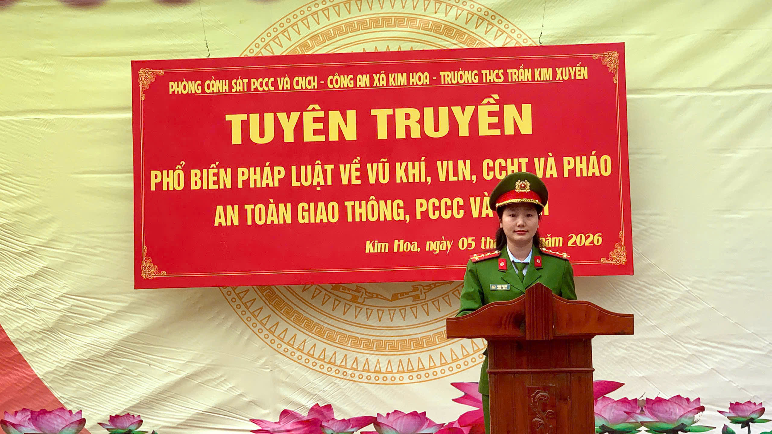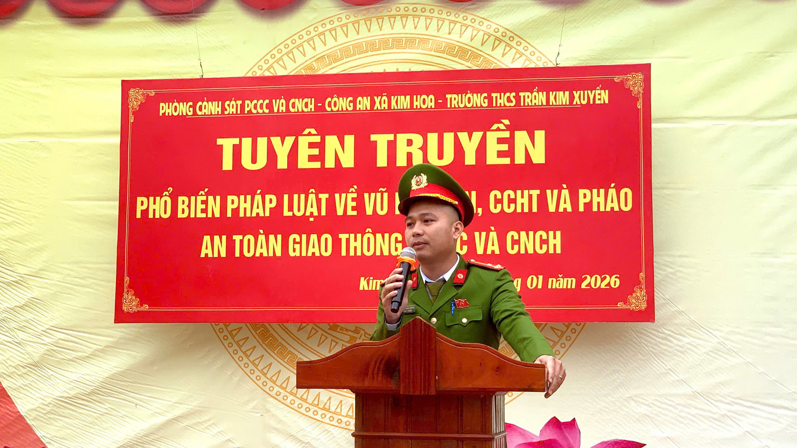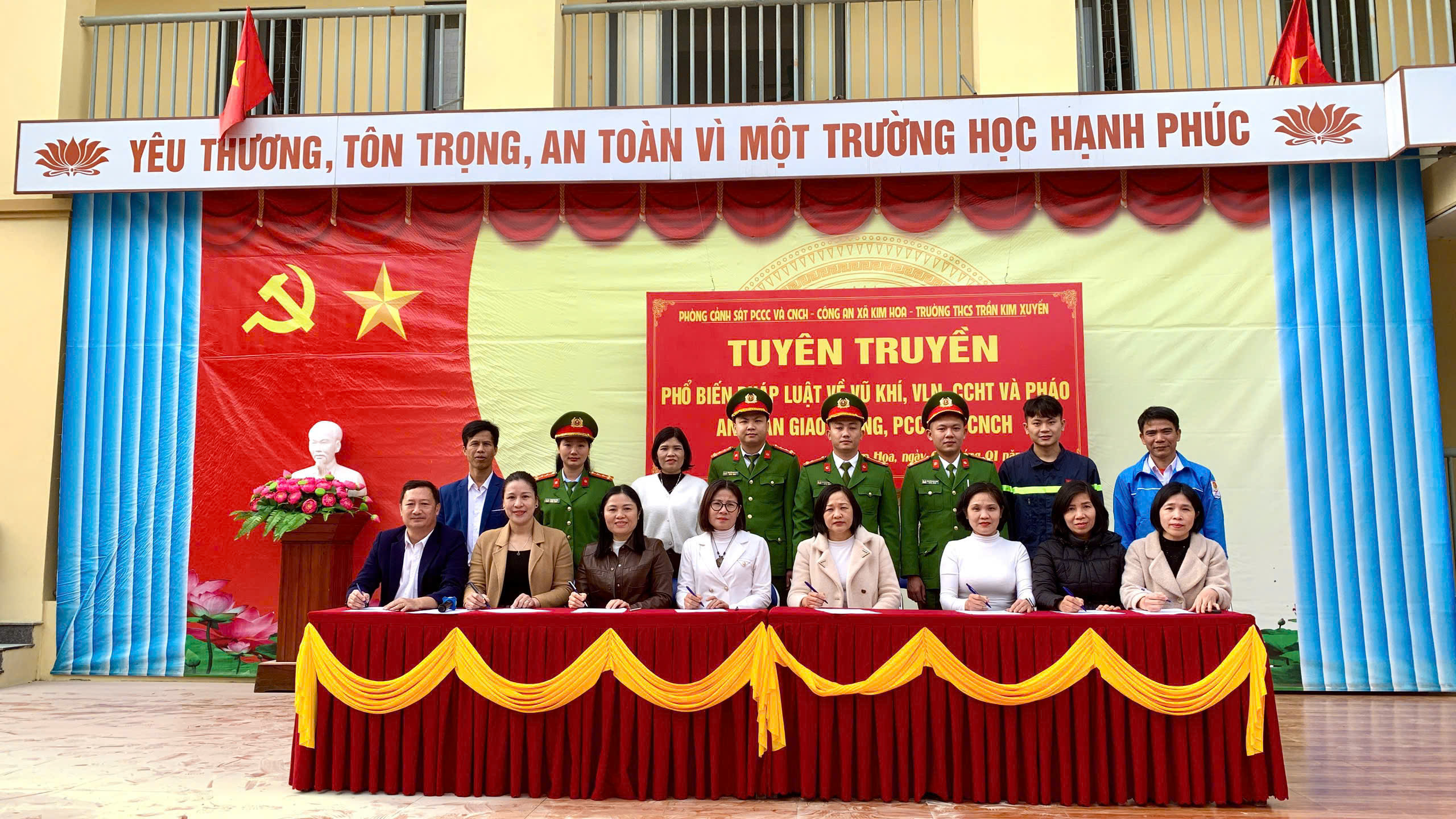 Kết thúc buổi tuyên truyền, đại diện cán bộ, giáo viên và học sinh Trường THCS Trần Kim Xuyến đã ký cam kết chấp hành nghiêm các quy định của pháp luật, góp phần đảm bảo an ninh trật tự trên địa bàn xã Kim Hoa trong dịp Tết Nguyên đán Bính Ngọ 2026.